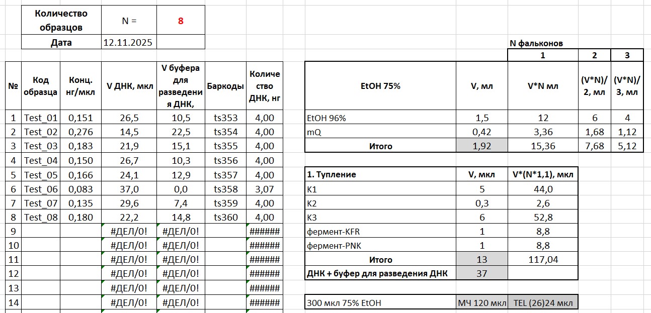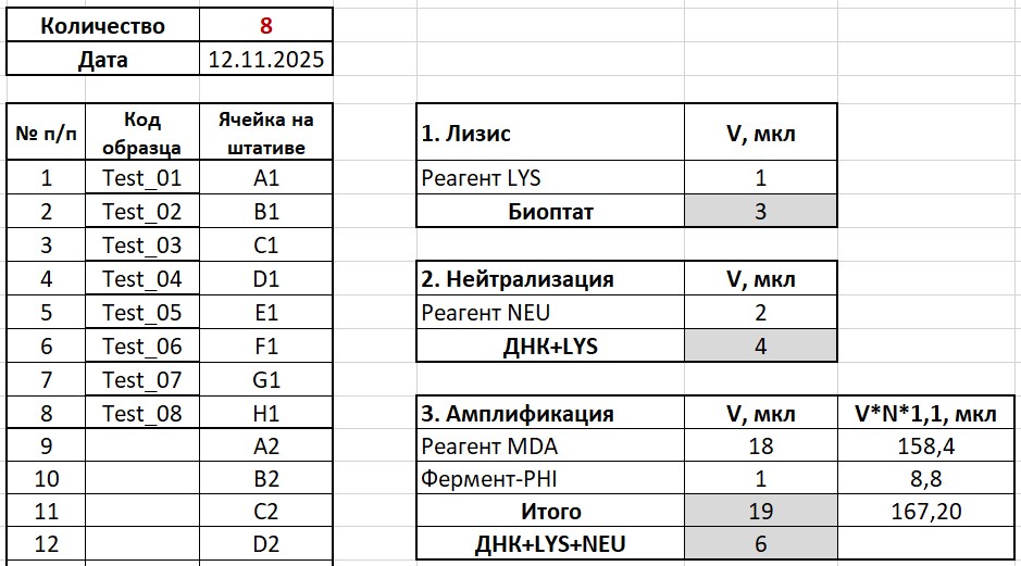- Автоматическая генерация таблиц смешивания реагентов на каждом этапе исследования;