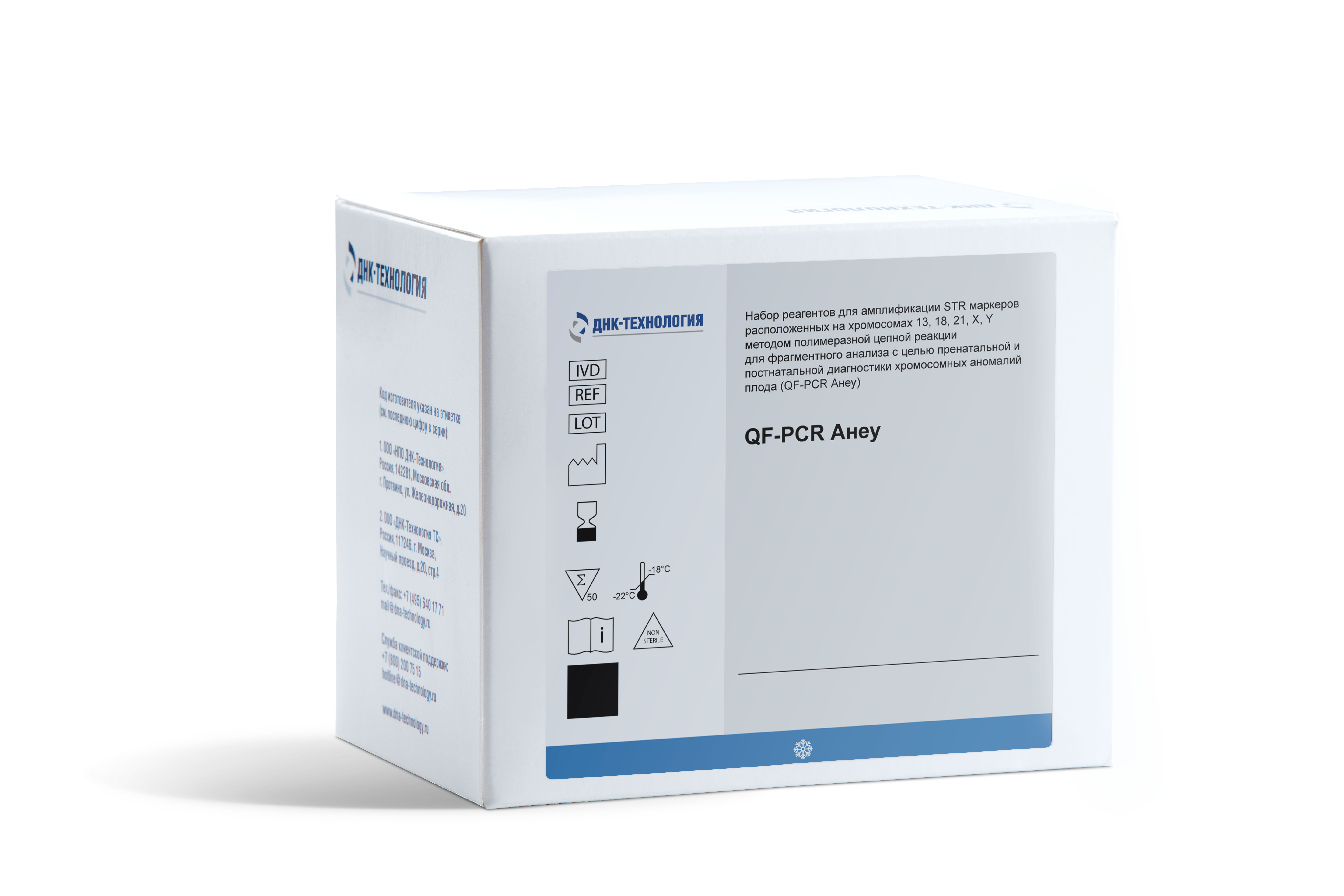 Набор реагентов QF-PCR Анеу предназначен для пренатальной диагностики в биологическом материале человека (эпителиальные клетки амниотической жидкости, биоптаты ворсин хориона) и постнатальной диагностики в биологическом материале человека (цельная кровь, секционный материал) хромосомных аномалий - трисомий по аутосомам 13,18,21 и анеуплоидий по половым хромосомам X и Y методом полимеразной цепной реакции с последующим проведением фрагментного анализа продуктов амплификации с использованием генетических анализаторов.